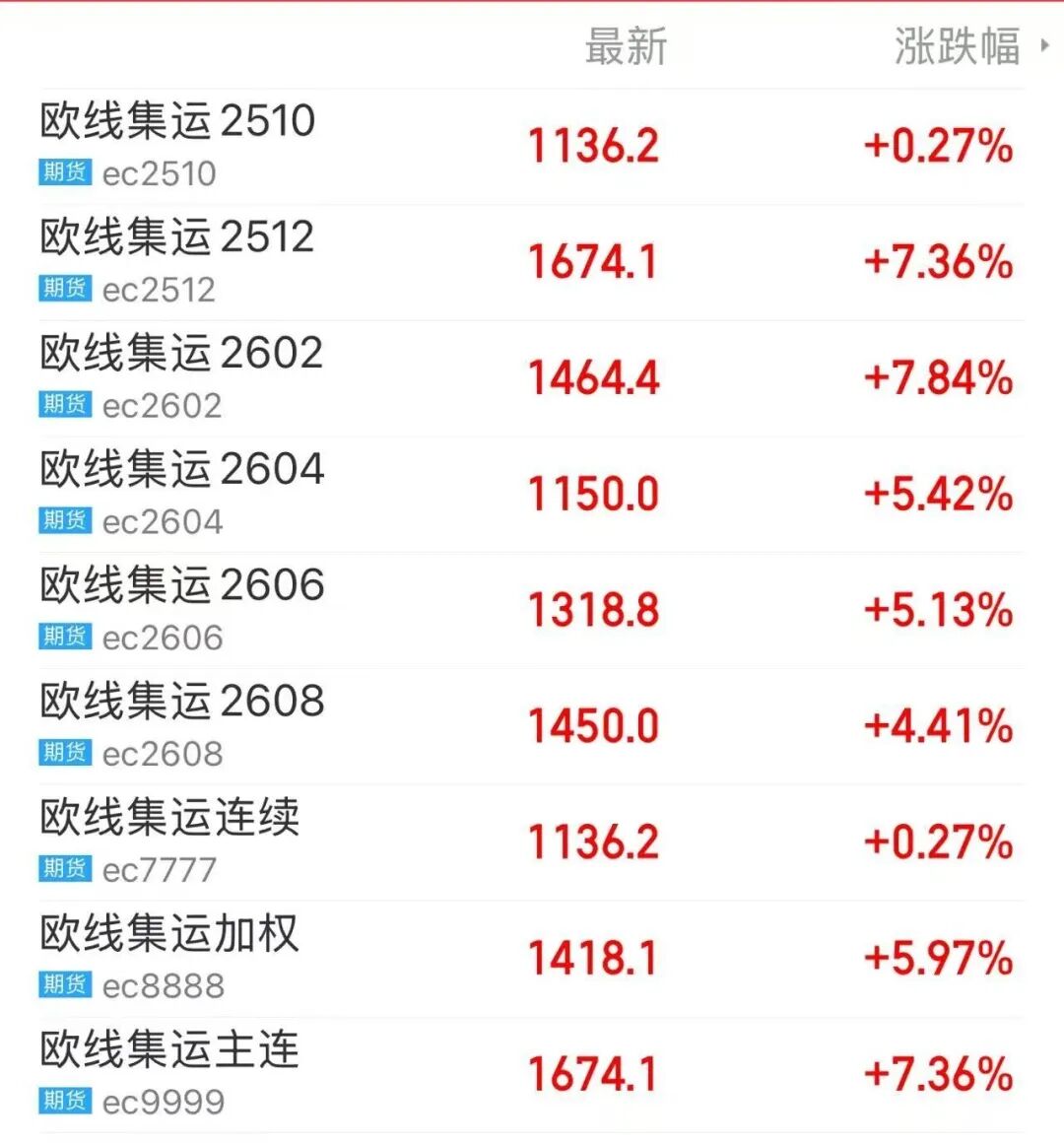 10月14日,集运指数(欧线)期货市场表现强劲,一改往日颓势,盘中快速拉升,主力2512合约大涨7.36%,收报1674.1点;2602合约大涨7.84%,收报1464.4点;多个远月合约上涨,市场关注度显著提升。此次集运指数期货大涨,与集运市场动态紧密相关。