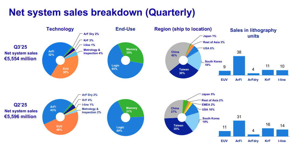 今年7月,阿斯麦曾警告,由于宏观经济和地缘政治的不确定性增加,该公司无法确认2026年是否能继续保持增长,导致其股价大跌。市场目前对该公司的指引十分关注,并将其视为人工智能信心的衡量指标之一。尽管阿斯麦强调2026年业绩将不逊于2025年,但该巨头也警告,明年中国市场的销量可能较去年和今年出现大幅下滑。这家公司目前受到荷兰本土出口限制和美国关税政策的双重影响。从公司资料看,三季度中国市场的销售占比达42%,较第二季的27%有明显上升,中国市场的重要性不言而喻。