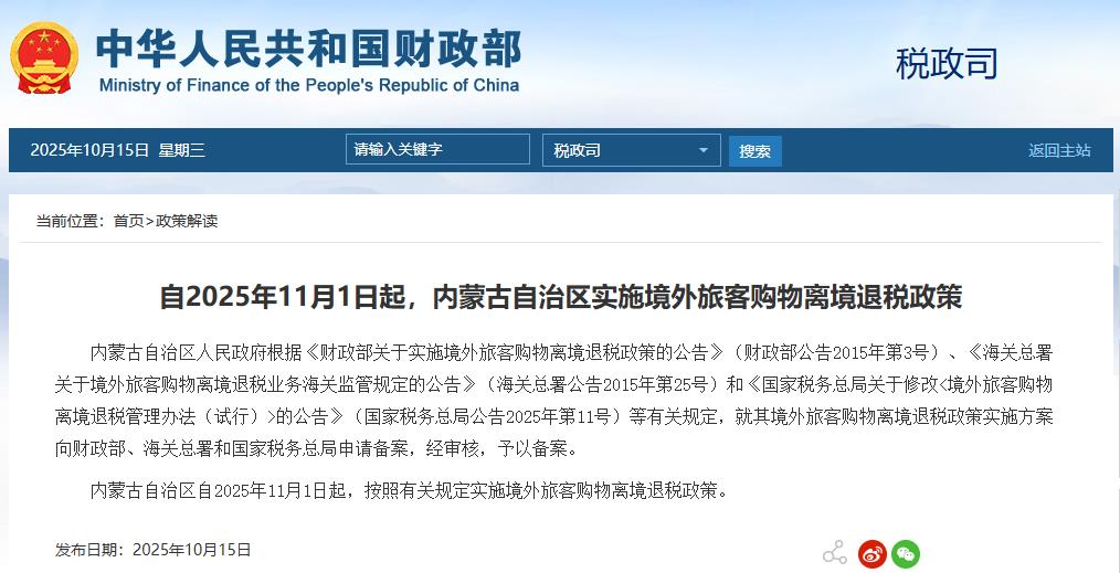 内蒙古2025年11月起实施境外旅客购物离境退税政策