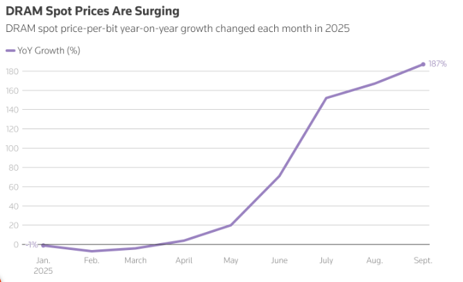 根据TechInsights提供的数据,用于各种应用的DRAM现货价格在4月份同比仅上涨4%之后,9月份已较去年同期上涨了近两倍。