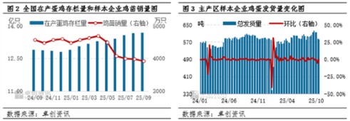 供应压力难降,季节性需求显著转弱,拖累蛋价回调。具体来看,供应侧,根据卓创资讯监测数据显示,9月末全国在产蛋鸡存栏量继续攀升,环比增幅0.22%。9月老母鸡出栏量增加,但9月新开产蛋鸡数量大于老母鸡出栏量,导致在产蛋鸡存栏量继续提升,叠加蛋鸡产蛋性能提升的影响,导致目前鸡蛋供应充足,对鸡蛋市场产生利空影响。