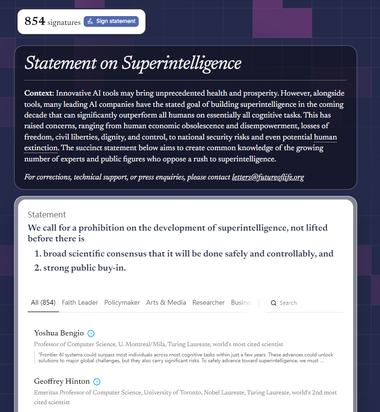 这不仅仅是学术上的绝望。就在这份请愿书发布之际,Meta将其人工智能部门更名为“Meta超级智能实验室”(Meta Superintelligence Labs),而OpenAI和马斯克(Elon Musk)的xAI则陷入了一场越来越公开的竞赛,看谁能首先实现人工通用智能。
