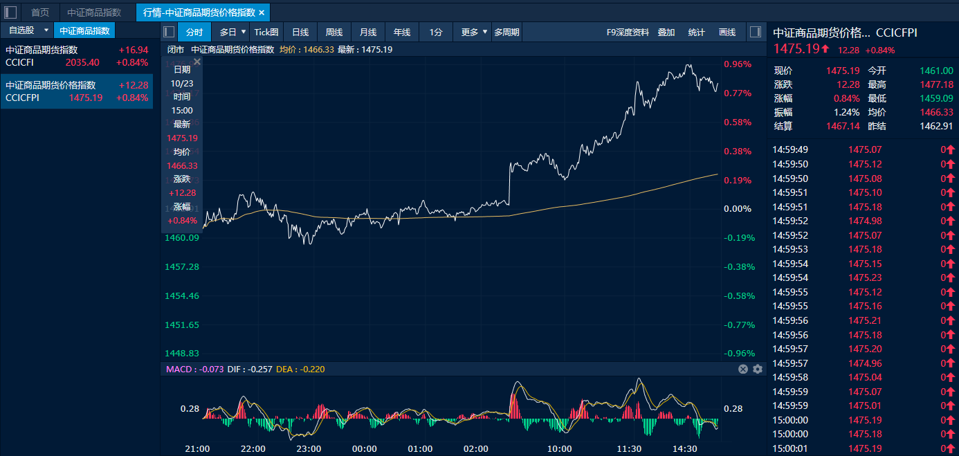 截至23日下午收盘,中证商品期货价格指数收报1475.19点,较前一交易日上涨12.28点,涨幅0.84%;中证商品期货指数收报2035.40点,较前一交易日上涨16.94点,涨幅0.84%。