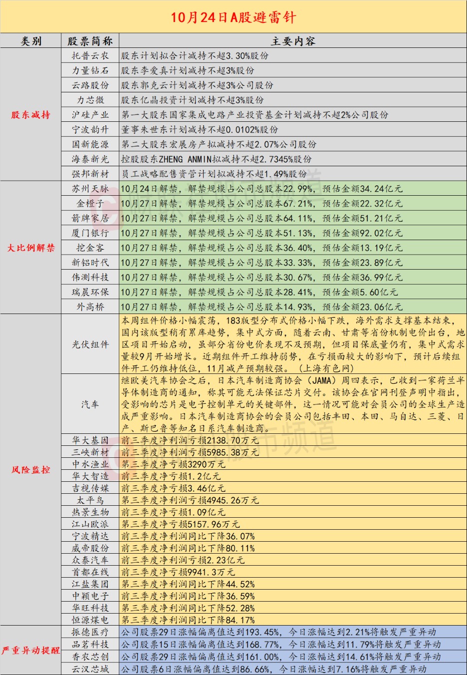 导读:财联社10月24日投资避雷针,近日,A股及海外市场潜在风险事件频发。国内经济信息方面,欧盟第19轮对俄制裁列单中国大型炼油厂和石油贸易商,引发市场关注;同时,近期组件开工维持弱势,11月减产预期较强,对产业链影响显著。公司方面,沪硅产业、力量钻石等公司股东计划减持股份,引发市场波动。海外市场方面,美国宣布将对俄罗斯大型石油公司实施制裁,原油价格飙升;苹果公司就App Store佣金问题败诉,或面临巨额赔偿。