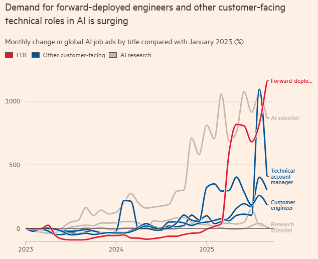 招聘平台Indeed数据显示,此类面向客户的人工智能岗位招聘需求,在2025年出现了激增。今年1月至9月间,FDE岗位的月度招聘发布量增长了逾800%,反映出市场对AI技术落地的强烈需求。