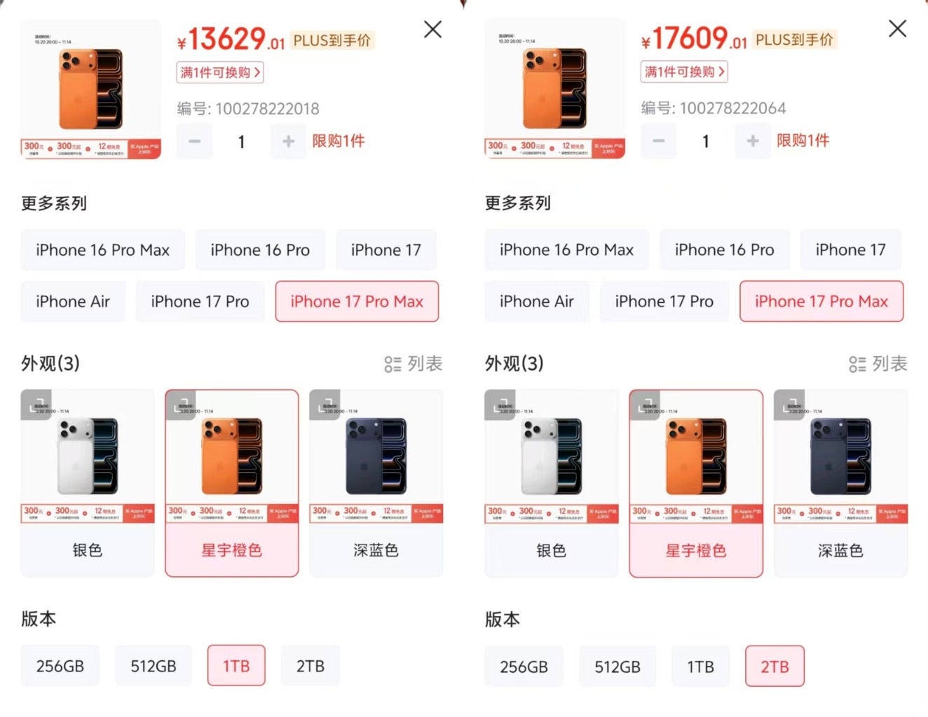 LPDDR是手机中常用的器件,主要用于临时存储手机运行时产生的各类数据,包括系统程序、视频缓存等。从今年的终端市场定价来看,不同内存规格下的手机价差在明显加大。社交媒体上,关于“内存比黄金还疯”的讨论热度在过去一个月居高不下,话题一度冲上微博热搜。“iPhone 17 Pro Max的2TB版本比1TB贵出整整4000块,安卓阵营这边,从256G加到512G,差价也普遍飙升到500-600元。”有消费者在电商平台查价后表示,一夜之间,“存储自由”成了奢侈品。