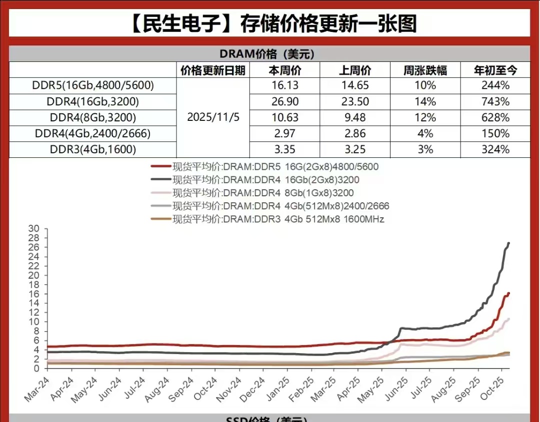 根据民生证券研究院整理的一份存储价格更新表,DDR4中4GB版本从年初到11月5日的涨幅为150%,而8GB和16GB版本的涨幅则高达628%和743%,近一周涨幅也普遍在10%以上。从价格看,DDR4的16GB的价格为26.90美元/颗,几乎是8GB的三倍。“我们预计存储产品价格在2026年上半年仍将维持上涨态势。到2026年下半年,随着存储原厂产能的释放,以及终端库存水平的提升,存储产品价格的上涨势头或将得到遏制,出现价格涨幅放缓甚至价格持平的可能性。”王旭东说。