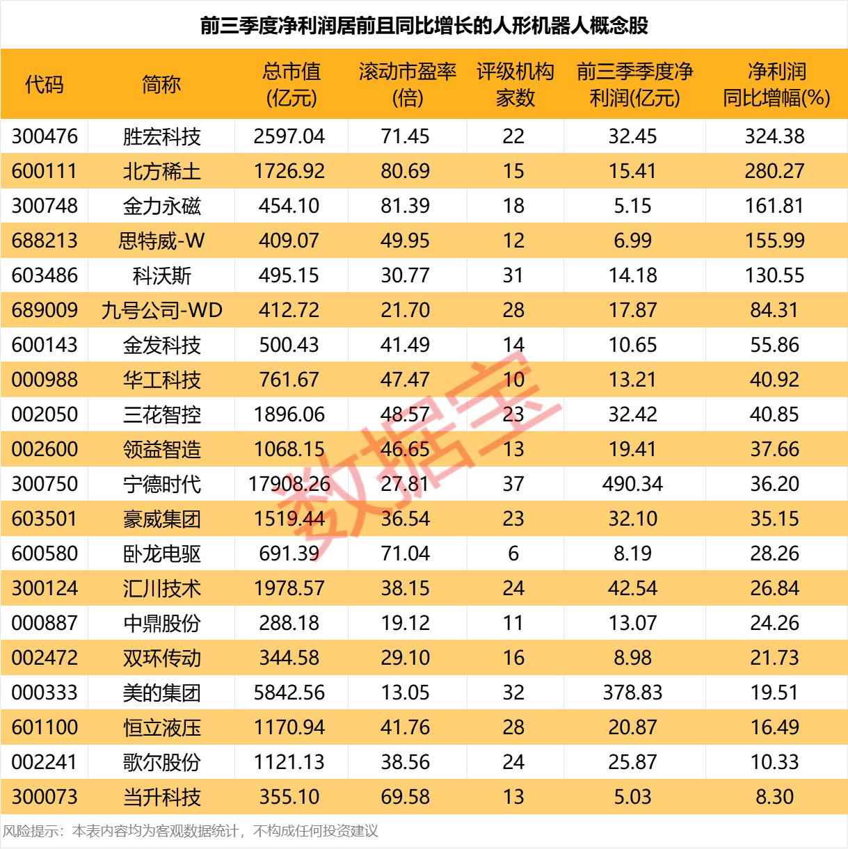 数据宝进一步统计,2025年前三季度净利润逾5亿元且同比实现稳定增长的人形机器人概念股,共计20只。其中,胜宏科技、北方稀土、金力永磁、思特威-W、科沃斯均实现翻倍增长,净利润增幅依次为324.38%、280.27%、161.81%、155.99%、130.55%。这些企业的强劲表现,进一步证明了人形机器人领域的巨大潜力和投资价值。