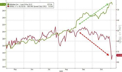 知名财经博客Zerohedge就指出,德意志银行据称正在研究的SRT结构看起来很像以前的CDO(担保债务凭证),以某种“数学魔术”般的方式分割成不同层级,能够蒙蔽评级机构的眼睛并获得良好的信用评分,这不禁让人联想到背后可能存在的风险。事实上,近来部分市场人士留意到的一个现象是,部分TMT板块投资级信贷资产与TMT股票的走势已显著脱钩。近期谷歌、META和甲骨文股价与其相关信贷资产的价格走势分歧,便能印证这一点……