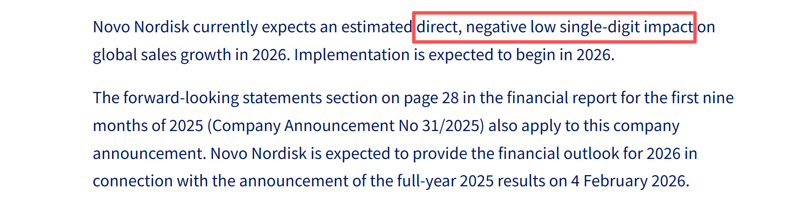 在随后发布的公告中,诺和诺德透露,与美国政府达成的协议将在2026年对全球销售增速直接产生“低个位数”的负面影响。公司预计将在2026年2月4日公布2025年业绩时提供2026年财务展望。