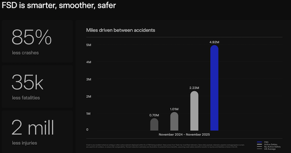 但无监督的FSD功能并非仅受限于技术迭代,而且也面临很多监管挑战。马斯克在股东大会上提到,特斯拉的FSD在中国目前只有“部分批准”,但预计将在2026年2月或3月左右获得完全批准,这显示了特斯拉在中国市场的积极布局。马斯克表示,特斯拉在允许车主边开车边发短信之前会“查看数据”。在股东大会上,特斯拉为了体现其FSD功能的安全性,公布了最新数据,数据显示,在开启FSD功能下,特斯拉车辆每行驶492万英里(约792万公里)才发生一次碰撞,而美国车辆的这个平均水平在每行驶70万英里(约113万公里)发生一次碰撞。据此,特斯拉表示,FSD减少了85%的碰撞。