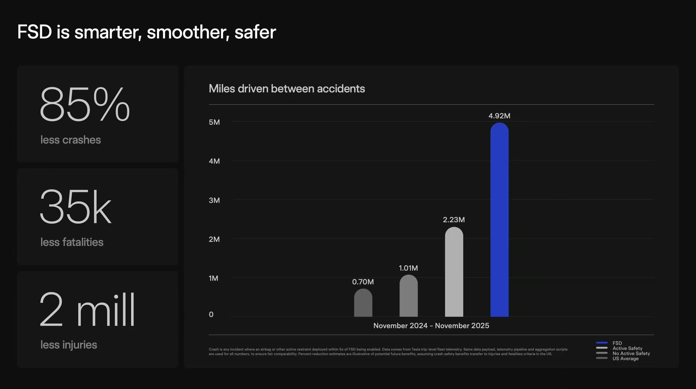 就自动驾驶而言,FSD(智能辅助驾驶系统)V14.1版本已经很流畅,V14.3版本将达到“睡一觉醒来就抵达目的地”的水平。他相信在未来几个月内,借助FSD技术,驾驶员将被允许边开车边发短信。此外,受监管的FSD Supervised目前已在6个国家/地区推出。