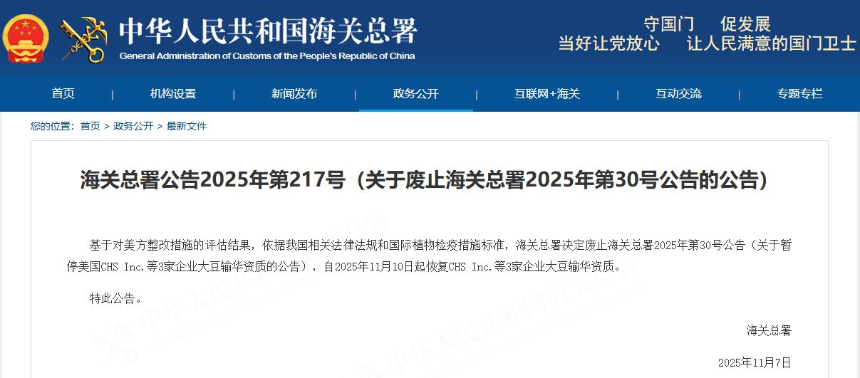 基于对美方整改措施的全面评估结果,依据我国相关法律法规和国际植物检疫标准,海关总署决定废止海关总署2025年第30号公告(关于暂停美国CHS Inc.等3家企业大豆输华资质的公告)。此举旨在优化大豆贸易环境,自2025年11月10日起恢复CHS Inc.等3家企业大豆输华资质,促进中美农产品贸易健康发展。
