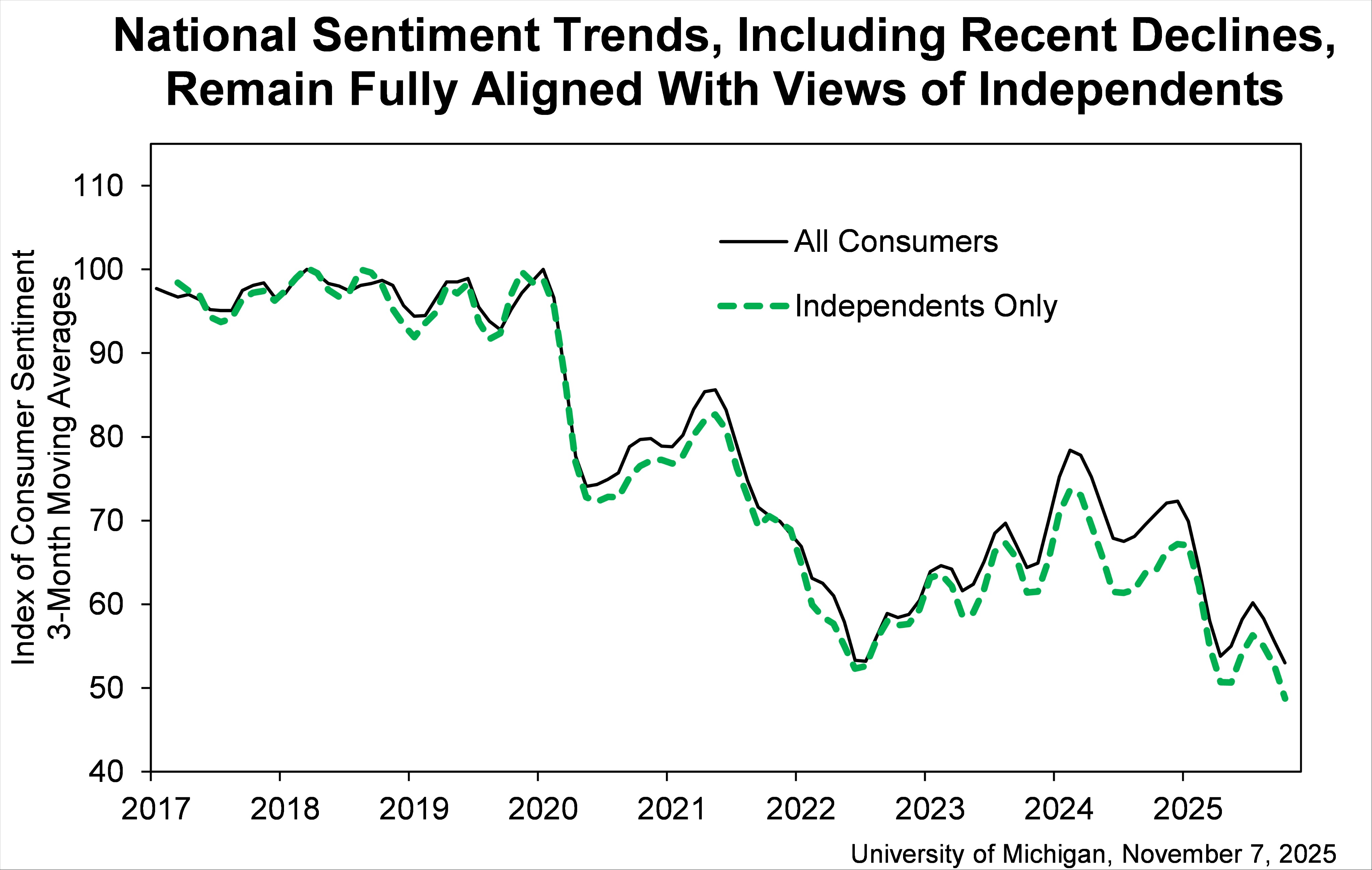 分析认为,这一系列指标反映公众对联邦政府关门影响的担忧持续加剧,美国经济形势不容乐观。报告指出,这种信心下滑在不同年龄、收入和政治群体中普遍存在。