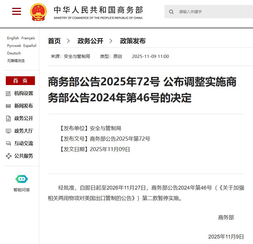 【商务部:《关于加强相关两用物项对美国出口管制的公告》第二款暂停实施】经批准,自即日起至2026年11月27日,出口管制新规下,商务部公告2024年第46号(《关于加强相关两用物项对美国出口管制的公告》)第二款暂停实施,这一举措对中美贸易将产生重要影响。
