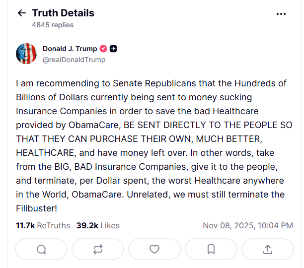 对此,贝森特表示,总统向参议院共和党人提出的医改建议尚未完全敲定。他在接受采访时表示,“我们还没有正式的提案。我们现在还没有向参议院提出提案,没有。”贝森特表示,任何此类提议都取决于政府停摆的结束,而政府停摆到周一将进入第41天。“总统在社交媒体上发布了相关消息,但我们必须先让政府重新运转起来,才能进行下一步。在重新开放政府之前,我们不会与民主党人进行谈判。就这么简单,”他说。