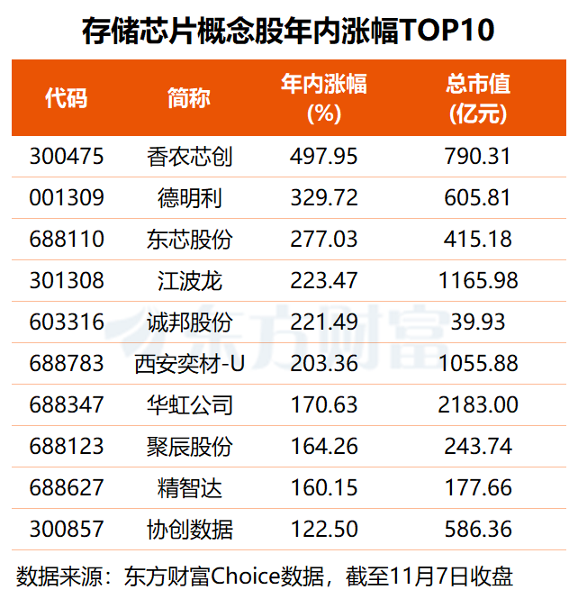 东方财富概念板块显示,A股市场目前共有78只存储芯片概念股,截至11月7日收盘,概念股合计A股市值约2.40万亿元。其中,市值超千亿的巨头有6家,华虹公司、中微公司、澜起科技分列前三,总市值分别为2183亿、1936亿和1490亿元。受益于AI主线行情,今年以来,存储芯片概念走势较好,板块指数累计上涨约64%,远超同期创业板指和科创50指数。板块内超九成概念股年内实现上涨,28股跑赢板块指数,14股股价翻倍。其中,香农芯创股价大涨近500%,德明利涨超3倍,东芯股份、江波龙、诚邦股份累计涨幅均在200%以上。