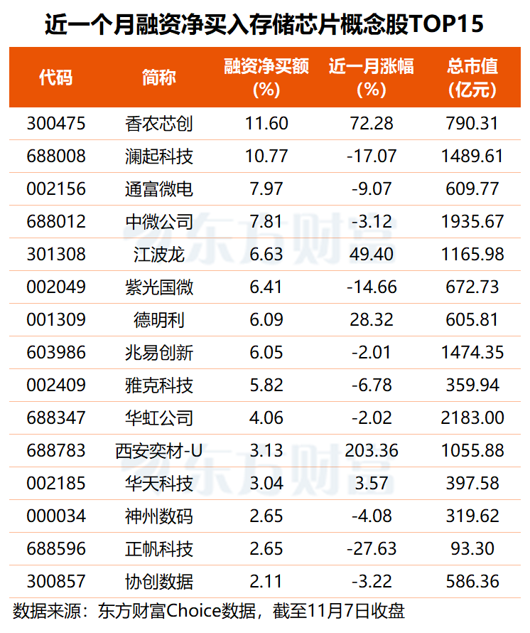 存储芯片概念火热,相关概念股也受到了杠杆资金的青睐。东方财富Choice数据显示,最近一个月,共有42只存储芯片概念股获融资客加仓。加仓规模在1亿元以上的有19股,其中9股超5亿元,分别是香农芯创、澜起科技、通富微电、中微公司、江波龙、紫光国微、德明利、兆易创新、雅克科技。香农芯创、澜起科技两股更是被融资客一个月内分别“扫货”11.60亿元和10.77亿元。