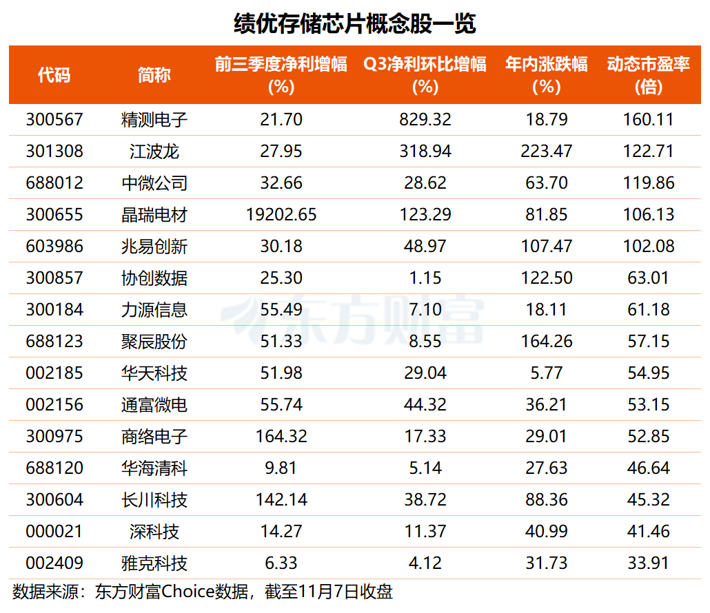 从业绩层面看,三季报显示,共有41只存储芯片概念股前三季度归母净利润实现同比增长,其中,晶瑞电材以19202.65%的增幅大幅领跑,深科达、概伦电子等6股净利同比增逾一倍。值得注意的是,前三季度净利同比增长且规模超1亿元,第三季度净利环比正增长的概念股共15只。其中,动态市盈率低于50倍的有4股,分别为华海清科、长川科技、深科技、雅克科技。除了长川科技,其余三股年内涨幅均跑输板块指数。