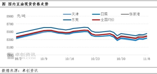 后期来看,11月10日马来西亚MPOB公布最新供需数据,显示10月棕榈油产量及库存环比增加,数据偏空油脂市场,将制约豆油涨幅。不过国内因局部停车检修的企业增加,豆油供应量有限,加之企业挺价心态强,预计本周豆油或震荡走高。(SEO关键词:豆油供应)