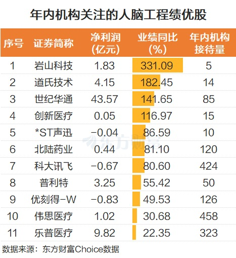 从机构调研,结合三季报数据来看,部分人脑工程概念股不仅获得了机构的积极调研,而且前三季度业绩同比大幅增长。比如世纪华通,前三季度归母净利润43.57亿元,同比增长141.65%。今年以来,该股的机构来访接待量为85。创新医疗前三季度业绩同比大增116.97%,年内机构来访接待量为15。北陆药业、科大讯飞、伟思医疗、乐普医疗等也在前三季度业绩同比明显增长,且年内被机构积极调研。