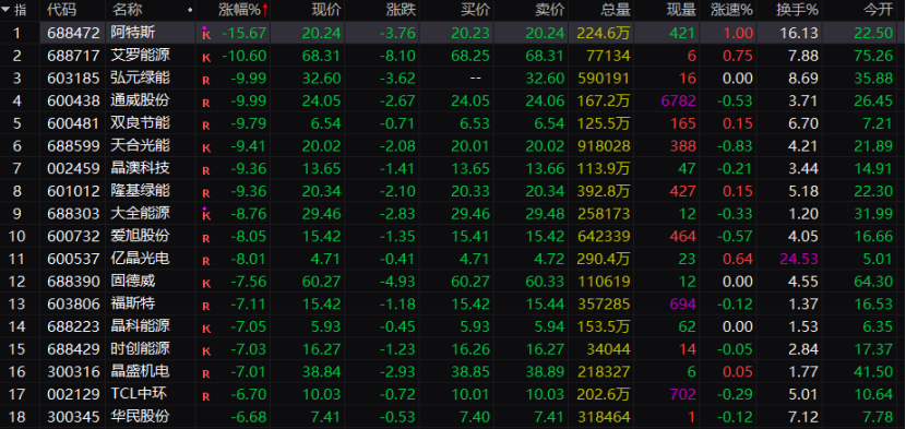 最近表现较强的光伏,今天跌疯了。阿特斯、艾罗能源、弘元绿能、通威股份、双良节能、天合光能等全线大幅走弱,光伏企业集体承压。