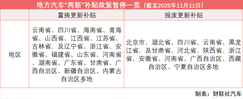 告别“金九银十”后,汽车以旧换新、报废更新“地补”政策迎来新一轮暂停。据财联社记者不完全统计,截至目前,暂停汽车置换补贴或报废更新补贴的省、直辖市、自治区已达九成,汽车补贴政策调整成为市场关注焦点。此外,上海等地按照“摇号”方式开展汽车报废更新和置换更新补贴活动。