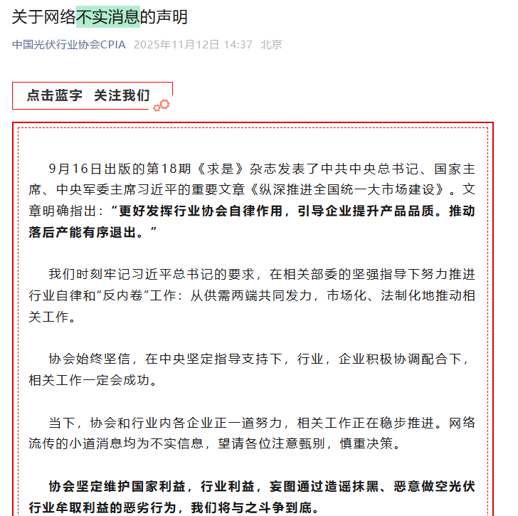 今日(11月12日)盘后,中国光伏协会在官微发布光伏行业不实消息辟谣声明,强调光伏行业稳定发展:“当下,协会和行业内各企业正一道努力,相关工作正在稳步推进。网络流传的小道消息均为不实信息,望请各位注意甄别,慎重决策。协会坚定维护国家利益,行业利益,妄图通过造谣抹黑、恶意做空光伏行业牟取利益的恶劣行为,我们将与之斗争到底。”