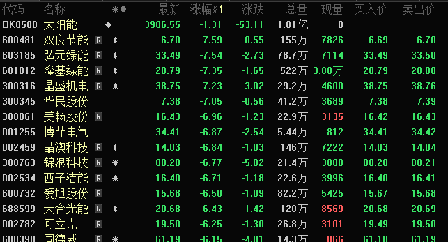 值得注意的是,今日光伏板块全线走低,其中龙头隆基绿能大跌超7%,阿特斯跌超14%,亿晶光电、双良节能、晶盛机电等跌超7%,通威股份、大全能源跌超5%。此次光伏板块股价波动引发市场关注。