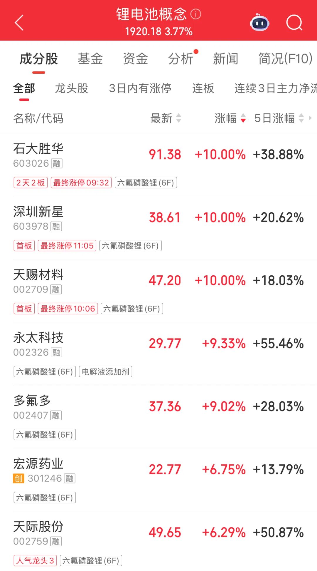 除了华盛锂电,早盘锂电池板块集体飙升。融捷股份、大中矿业等锂矿股涨停,富祥药业“20cm”涨停,孚日股份、维科技术、沧州明珠等10多只个股涨停,还有众多个股涨超10%,锂电池板块的赚钱效应显著。