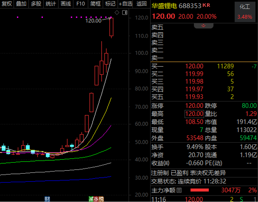 此前已经七连阳的华盛锂电继续大幅高开,开盘15分钟左右即封上“20cm”涨停板。截至上午收盘,该股报收120元/股,上涨20%,股价再度创出历史新高。
