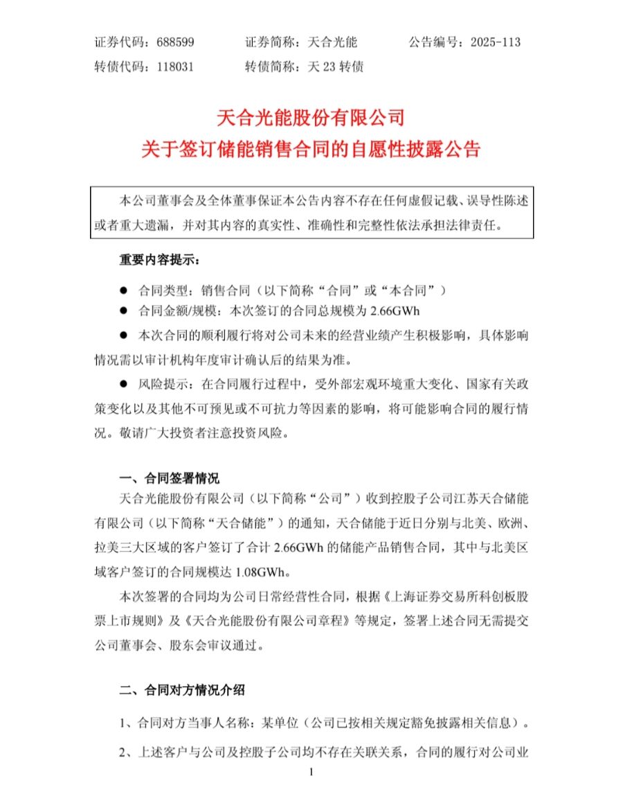 公告称,其控股子公司天合储能近日分别与北美、欧洲、拉美三大区域客户签订合计2.66GWh储能产品销售合同。这标志着光伏组件大厂在储能板块再度揽下大单,储能业务成为光伏企业新的利润增长点。