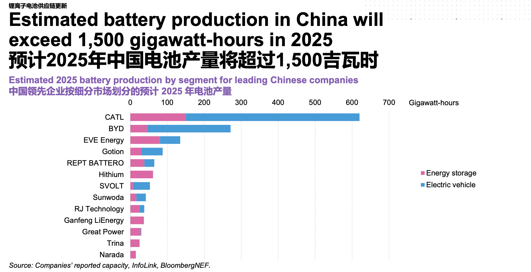 工信部数据显示,去年中国储能型和动力型锂电池产量分别为260 GWh、826 GWh,前者约为后者的三成。具体到企业,彭博新能源财经预计,今年宁德时代(300750.SZ)电池产量超600 GWh,比亚迪(002594.SZ)近300 GWh,亿纬锂能(300014.SZ)超100 GWh。