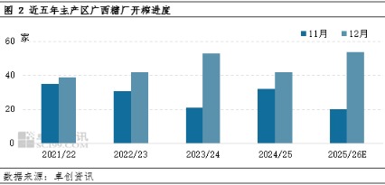 广西作为国内白糖主产区,2024/25榨季糖产量646.5万吨,占全国的57.92%。25/26榨季受干旱及洪涝影响,食糖产量增速或放缓。但由于甘蔗种植面积增加,食糖总量保持在660万吨以上。广西首家糖厂开榨时间同比推迟7天,支撑价格短时处于高位。截至12月2日,广西开榨糖厂数量为39家,同比减少22家。