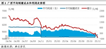 新榨季广西糖企理论制糖成本依旧处于高位水平。2025/26榨季广西普通糖料蔗收购价格为510元/吨,产糖率预计在12.85%,即吨糖耗蔗在7.78吨。加上生产成本,目前广西糖厂的平均理论制糖成本在5624元/吨。按照5465元/吨的广西南宁白糖平均售价,截至12月3日,糖厂平均理论亏损158.6元/吨。