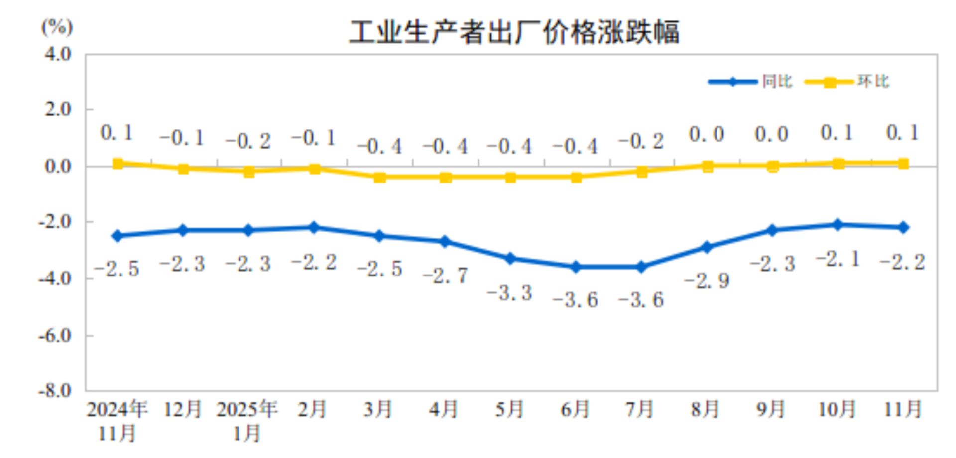 PPI环比上涨0.1%,连续两个月上涨。受上年同期对比基数走高影响,PPI同比下降2.2%,降幅比上月扩大0.1个百分点。