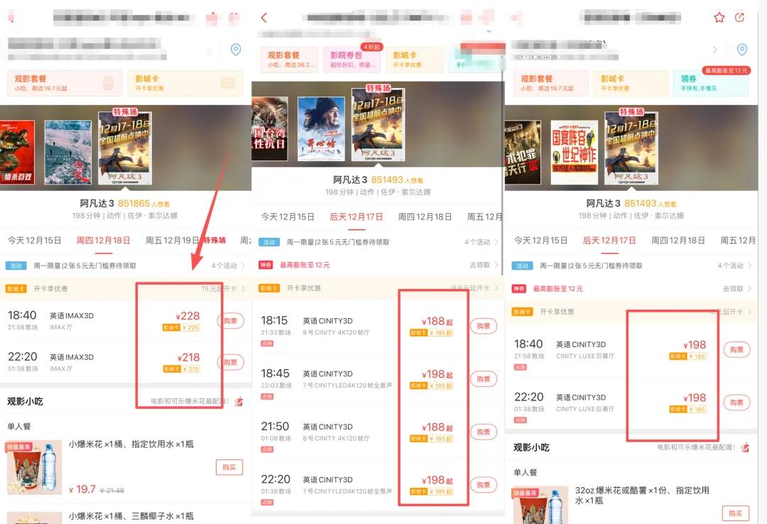 据红星新闻,记者从各大售票平台看到,成都多家影院已经开启预售,票价从17.8元到280元不等,其中,低价票为影城推出的活动,座位数量有限。IMAX、CINITY等特效厅的票价相对较高。其中IMAX 3D的场次票价可达180元甚至200元。