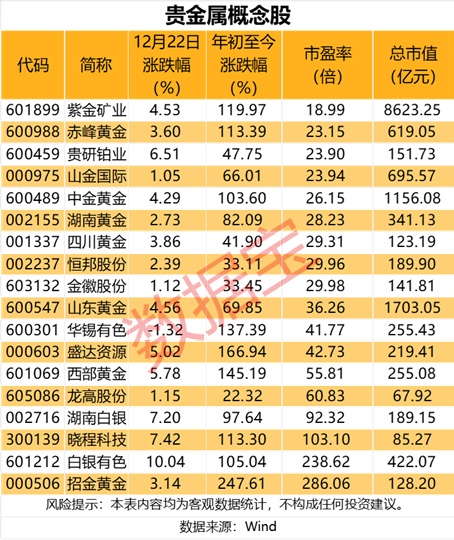 证券时报·数据宝统计显示,A股中贵金属概念股共有18只,年初至今平均上涨97.03%,招金黄金、盛达资源、西部黄金等9股累计涨幅均超过100%。在持续上涨后,贵金属概念股估值已处于相对高位,滚动市盈率中位数达到33.12倍,仅4股市盈率最新处于25倍以下,包括紫金矿业、赤峰黄金、贵研铂业、山金国际。