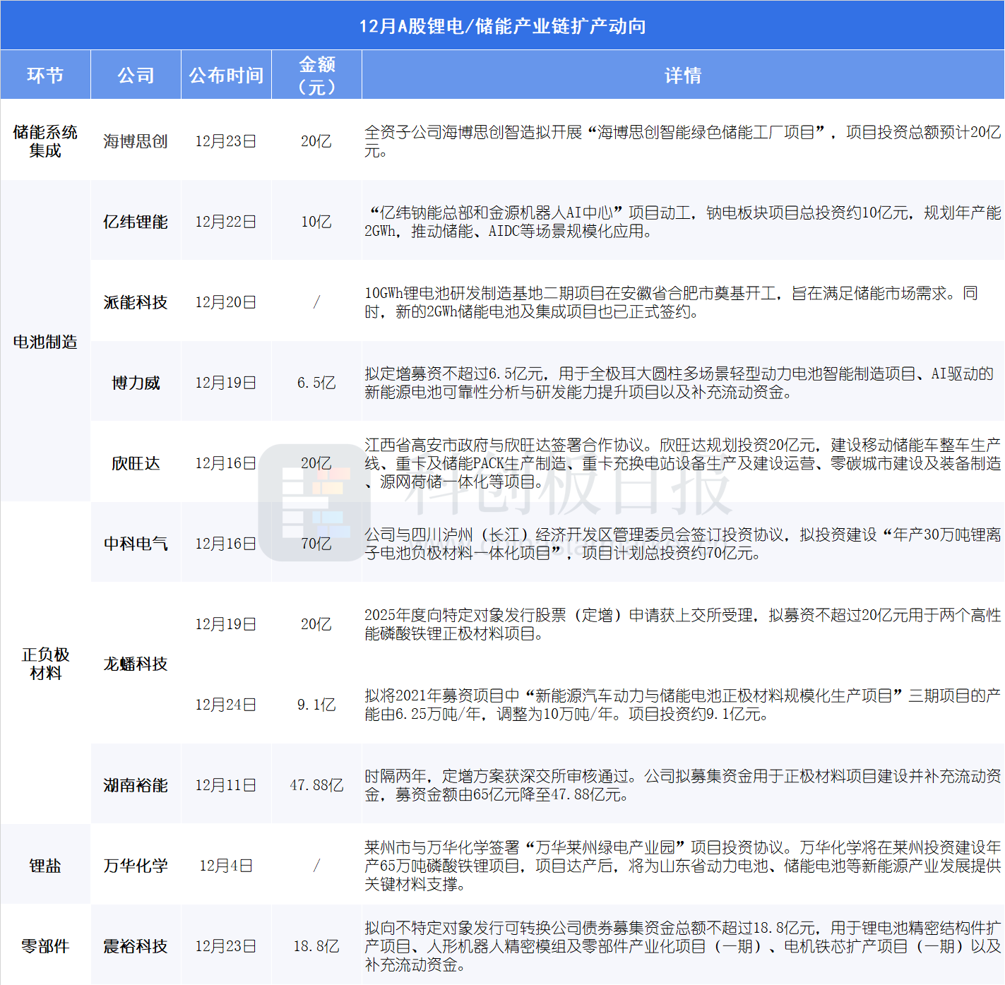 一个个长单陆续落地的同时,更为密集的则是整个产业链的扩产动作。据《科创板日报》不完全统计,12月已有至少10家公司披露产能扩张新动向,涉及环节囊括储能系统集成、电池制造、正负极材料、锂盐与电池结构件。
