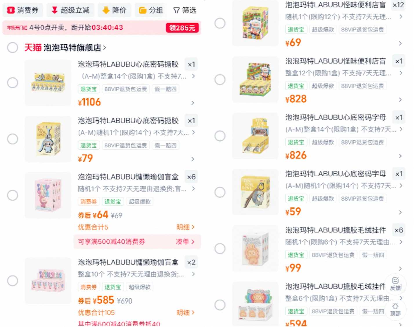 1月3日,第一财经记者发现,泡泡玛特天猫旗舰店里,LABUBU多系列已不再缺货。前方高能、心底密码、慵懒瑜伽、怪味便利店等系列均可购买单盒或端盒(即一盒数个完整“端下”,保证常规款不重复)。在数月前,连预售订单都需要靠抢才能得到的同款产品,如今已是48小时内保证发货的现货状态。