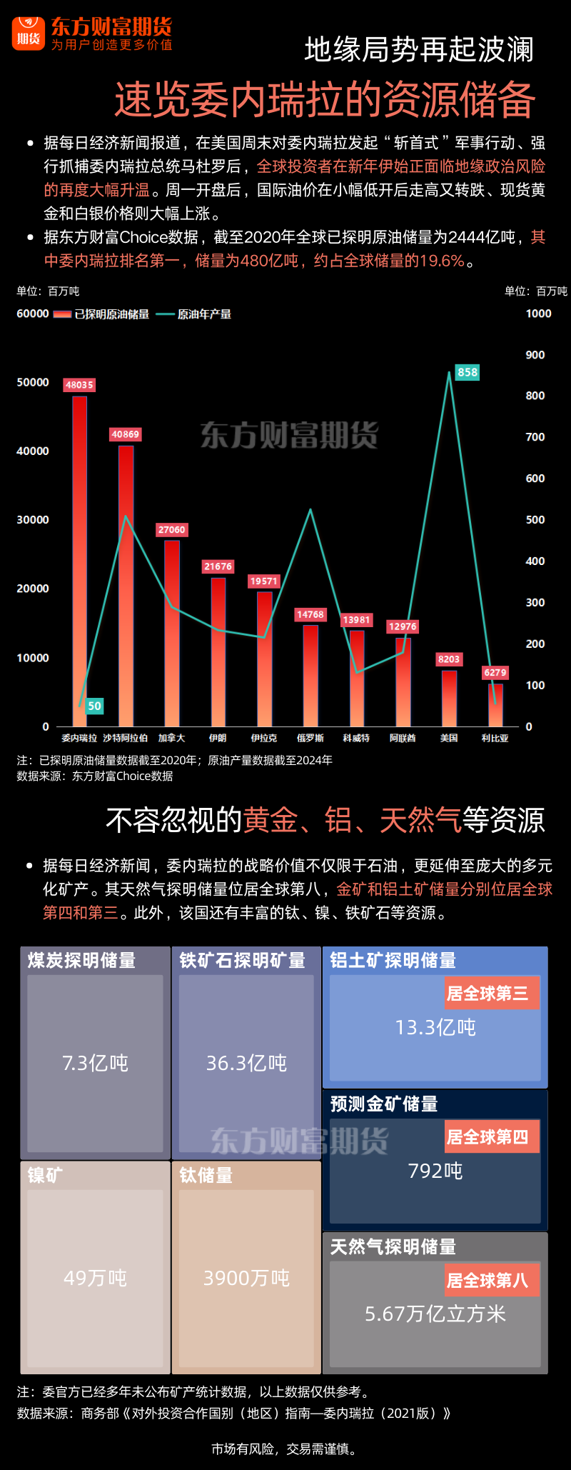 划重点!委内瑞拉不仅石油资源丰富,其铝土矿、金矿、天然气等多元化矿产资源同样丰富。铝土矿储量全球第三;金矿储量全球第四;天然气探明储量全球第八;此外,该国还有丰富的钛、镍、铁矿石等资源。
