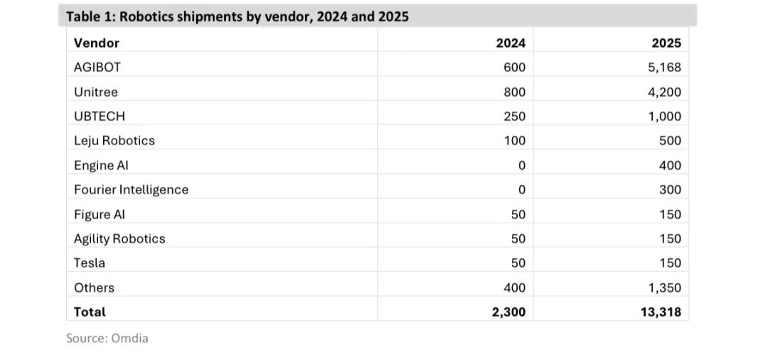 2025年,全球人形机器人市场迈入快速增长阶段,全年总出货量预计达1.3万台。中国厂商表现突出,智元以超过5100台的年度出货量,占据全球39%的市场份额,位居全球第一。