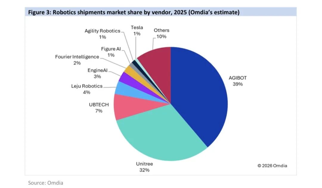 智元2025年销售收入超过10亿元,远超2024年的数千万元。预计2026年将保持数倍增长。宇树、优必选也位列全球前列,分别占据32%、7%的市场份额。
