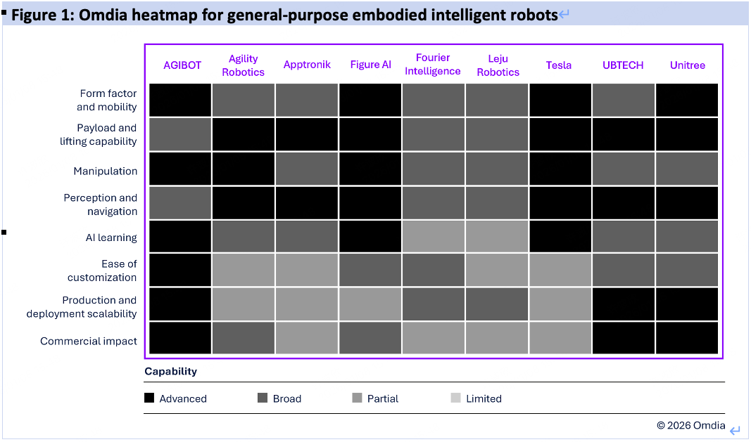 报告预计,中国和美国的多家机器人公司将在2025年取得显著增长,但出货量在150台至500台间。Omdia根据多个维度划分了全球人形机器人公司梯队,智元、Figure AI等公司位列第一梯队。