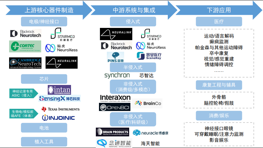 该机构进一步建议,聚焦产业链核心环节与技术路线,优先选择具备壁垒的标的。上游可关注脑电传感器、核心芯片等硬件供应商,受益于设备量产带来的放量需求;中游重点布局拥有核心专利与临床资源的企业,尤其是侵入式领域技术对标国际、非侵入式场景落地快的龙头;下游可跟踪在康复医疗、工业控制等细分场景形成商业化闭环的标的,同时关注“AI+脑机”“机器人+脑机”的生态协同机会。