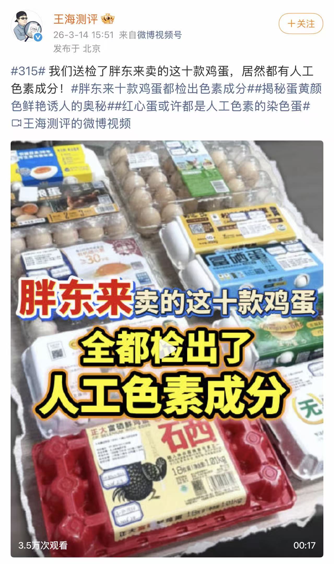 正值“3·15”国际消费者权益日,号称“鸡蛋界的LV”的黄天鹅却陷入信任危机——被指“检出人工色素”。
