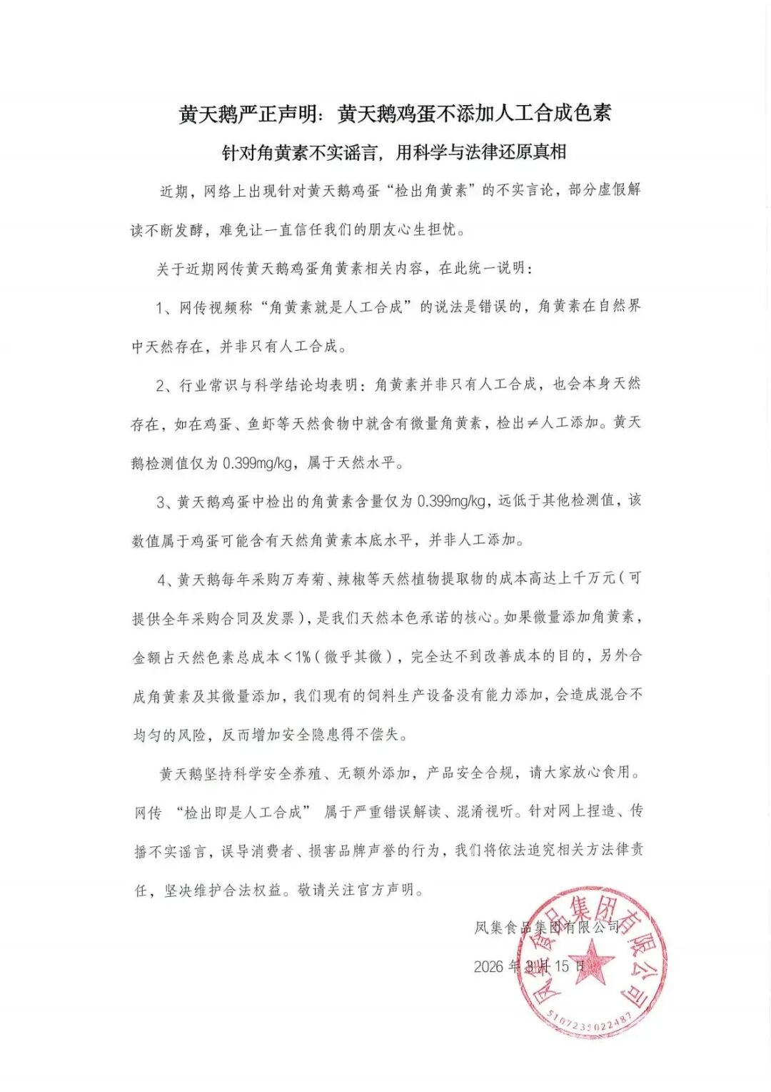 事件持续发酵至3月15日晚间,黄天鹅母公司凤集食品集团有限公司发表声明称:黄天鹅鸡蛋不添加人工合成色素。网传视频称“角黄素就是人工合成”的说法是错误的,角黄素在自然界中天然存在,并非只有人工合成,也会本身天然存在,如在鸡蛋、鱼虾等天然食物中就含有微量角黄素,检出不等于人工添加。