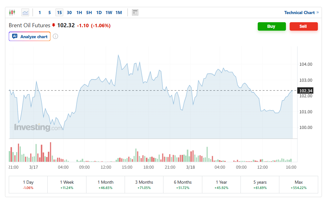 此前一日,国际油价上涨约3%。鉴于伊朗冲突尚无缓和迹象——该冲突已导致中东地区石油出口基本停滞——布伦特原油期货价格已连续四个交易日收于100美元/桶以上。