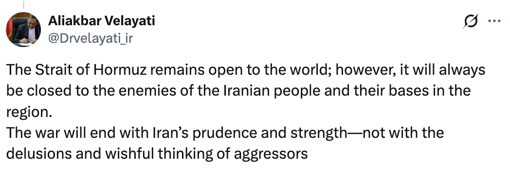 当地时间4月2日,伊朗最高领袖外事顾问、前外长韦拉亚提在其个人社交媒体平台账号上表示,霍尔木兹海峡对世界开放,但对伊朗人民的敌人及其在该地区的据点将永远关闭。