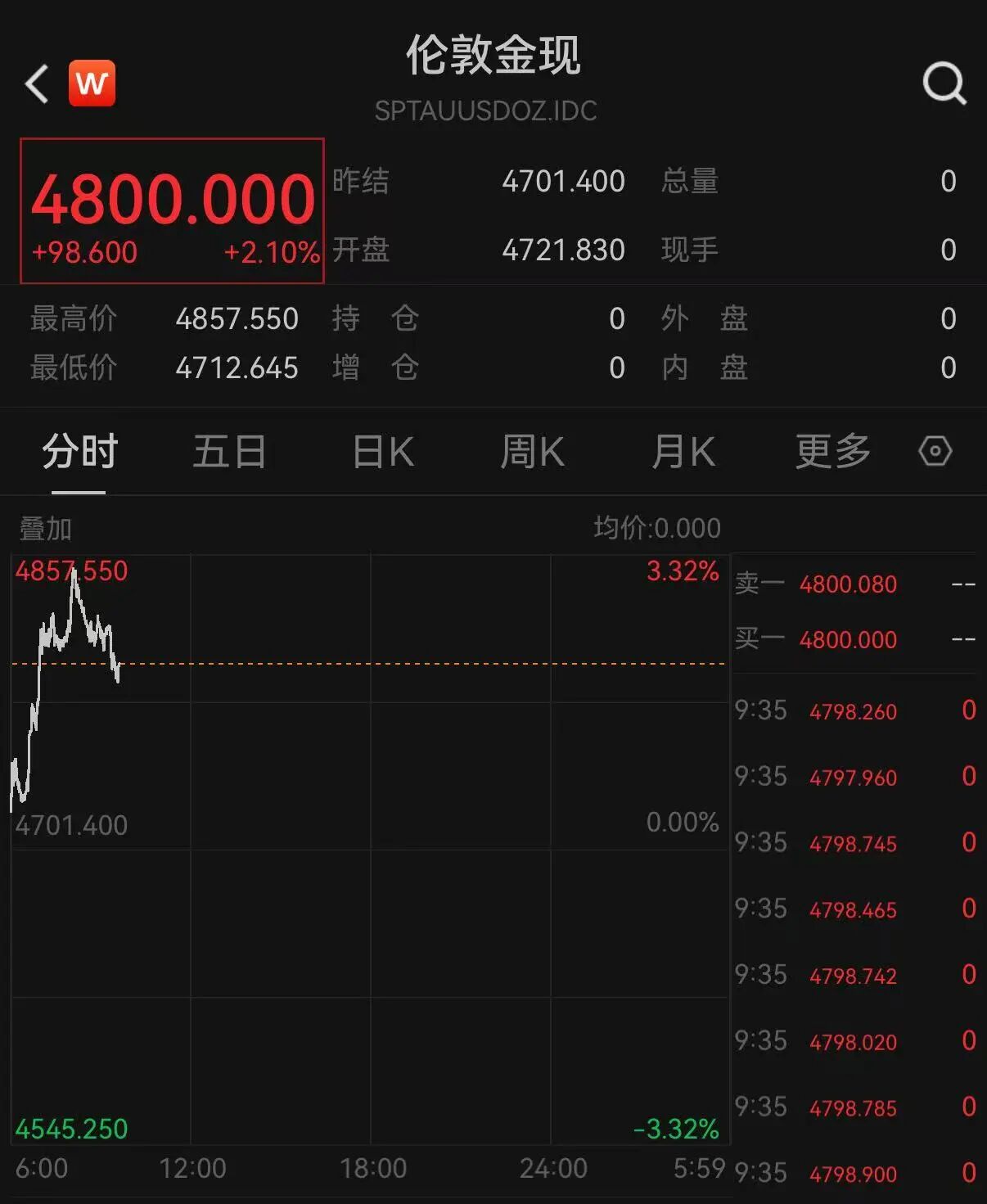 北京时间4月8日早盘,现货黄金持续上扬,盘中突破4800美元,最高报4857.550美元/盎司,涨超3%。截至发稿有所回落,报4800.000美元/盎司,涨2.1%。